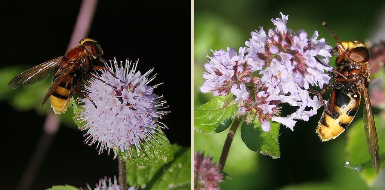 In Gewässernähe werden auch gerne die Blüten der Wasser-Minze für eine Pollenmahlzeit (links) und einen stärkenden Nektartrunk (rechts) genutzt. Fotos: M. Neitzke