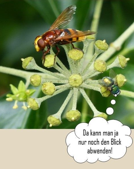 Die Hornissenschwebfliege besucht sowohl Blüten mit offen dargebotenem Nektar, wie die Blüten des Efeus (Hedera helix) (links), als auch Blüten mit mittelangen und relativ engen Blütenröhren wie die bis zu 1 cm langen Röhrenblüten des Wasserdostes (Eupatorium cannabinum). Fotos: M. Neitzke