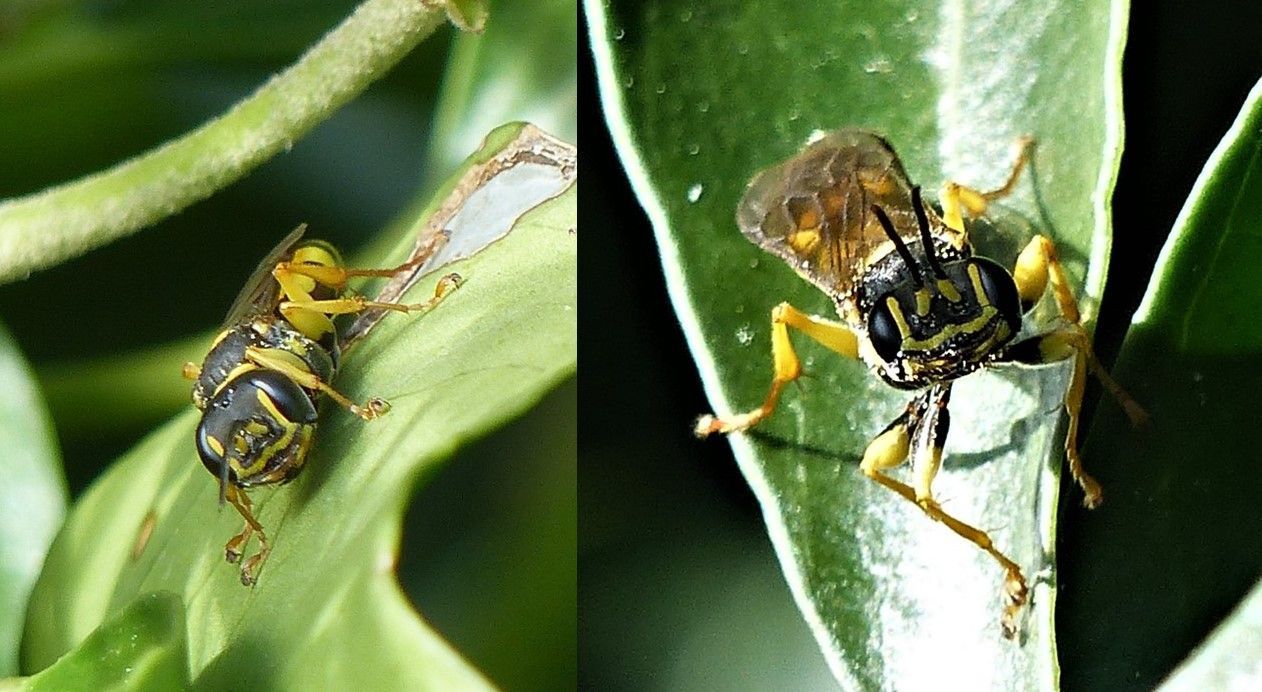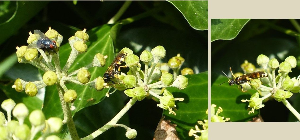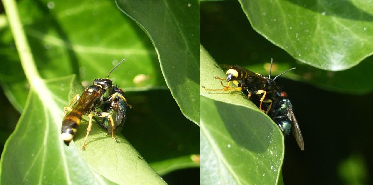 Deutlich ist an der in einem Efeu auf Beute lauernden Kotwespe das stielartig verlängert 1 Hinterleibssegment zu erkennen. Auf der linken Abbildung hat die Wespe eine Blütendolde des Efeus und auf der rechten ein Blatt als Ausguckwarte gewählt. Fotos: M. Neitzke