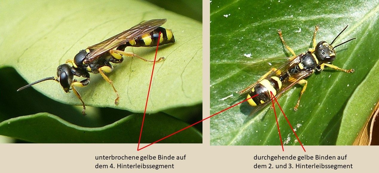 Charakteristisch für die Kotwespe ist das schwarz-gelbe Streifenmuster der Hinerleibssegmente, bei dem der Streifen auf dem 4. Segment unterbrochen ist. Fotos: M. Neitzke