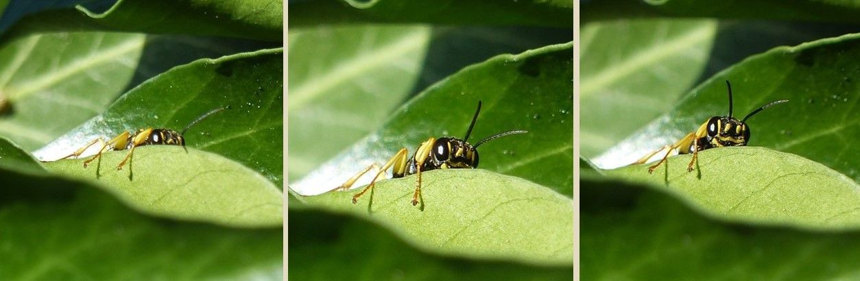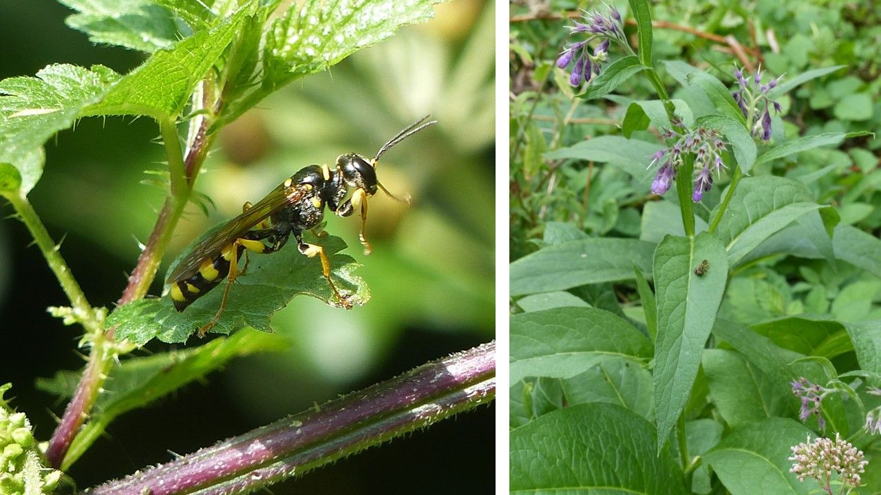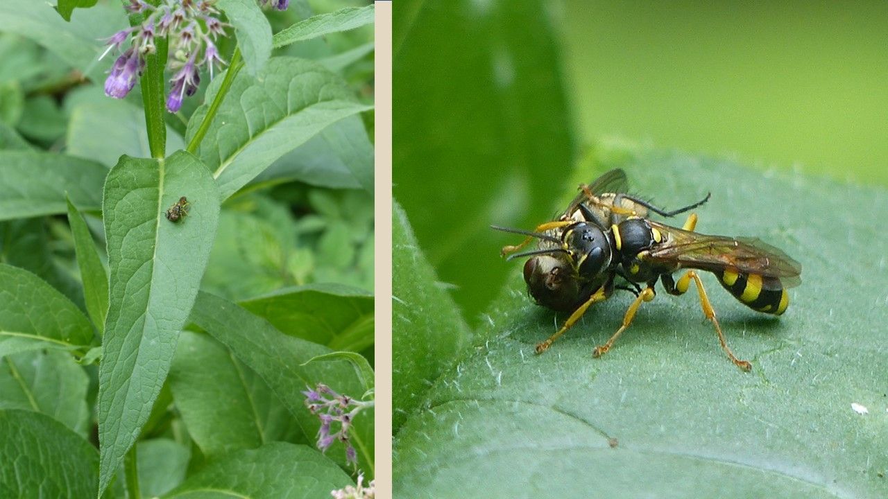Eine Kotwespe lauert in einer Brennnessel (Urtica dioica) auf Beute. Sprungbereit mit angezogenen Vorderbeinen sitzt sie auf einem Brennnesselblatt (links). An einer Beinwellpflanze (Symphytum officinale) hatte sie Jagdglück. Sie ist mit ihrer Beute auf einem der großen Blätter gelandet (rechts). Fotos: M. Neitzke
