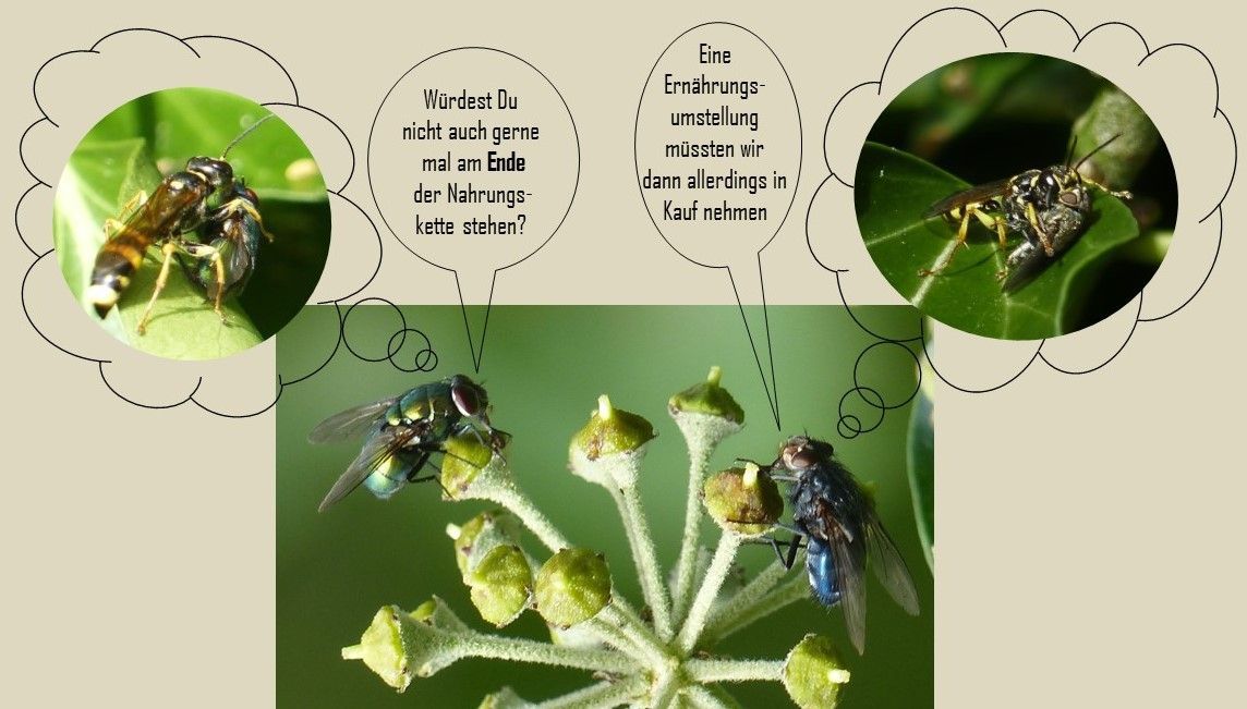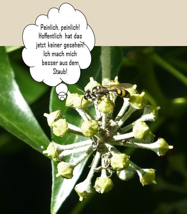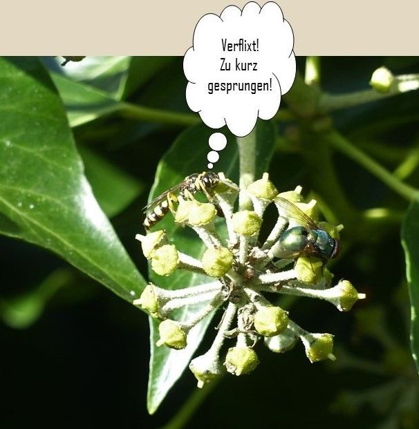 Die Kotwespe hat eine geeignete Beute, eine Fliege, auf einer Blütendolde des Efeus erspäht. Ohne dass die Fliege es bemerkt, kommt sie ihrem Opfer, gefährlich nahe. Nicht einmal eine Doldenweite beträgt der Abstand zwischen Leben und Tod (links). So nimmt das Drama seinen Lauf.