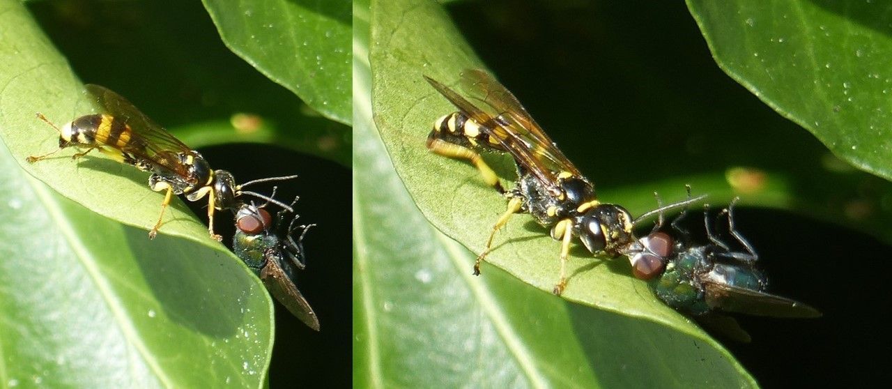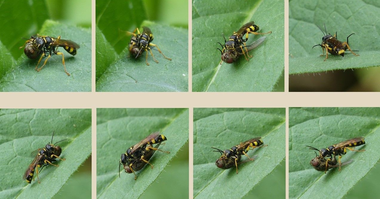 Auch die Jagd in einer Hochstaudenflur war erfolgreich. Die Kowespe landet mit der von ihr überwältigten Beute auf einem der großen Blätter des Beinwelles, in dem sie auf der Jagd war. Fotos: M. Neitzke