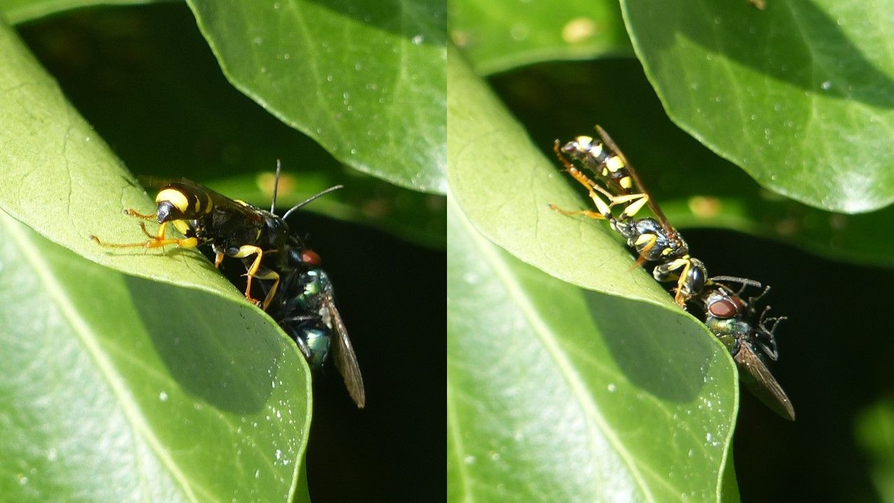 Mit ihren kräftigen Mundwerkzeugen überwältigt die Kotwespe ihre Opfer, wie hier eine Fliege. Fotos: M. Neitzke