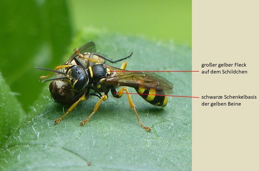 Bestandteil der gelben Musterung des Körpers ist auch der unübersehbare große gelbe Fleck auf dem Schildchen, sowie die bis auf die schwarze Schenkelbasis gelben Beine.[1, 2, 3, 4]