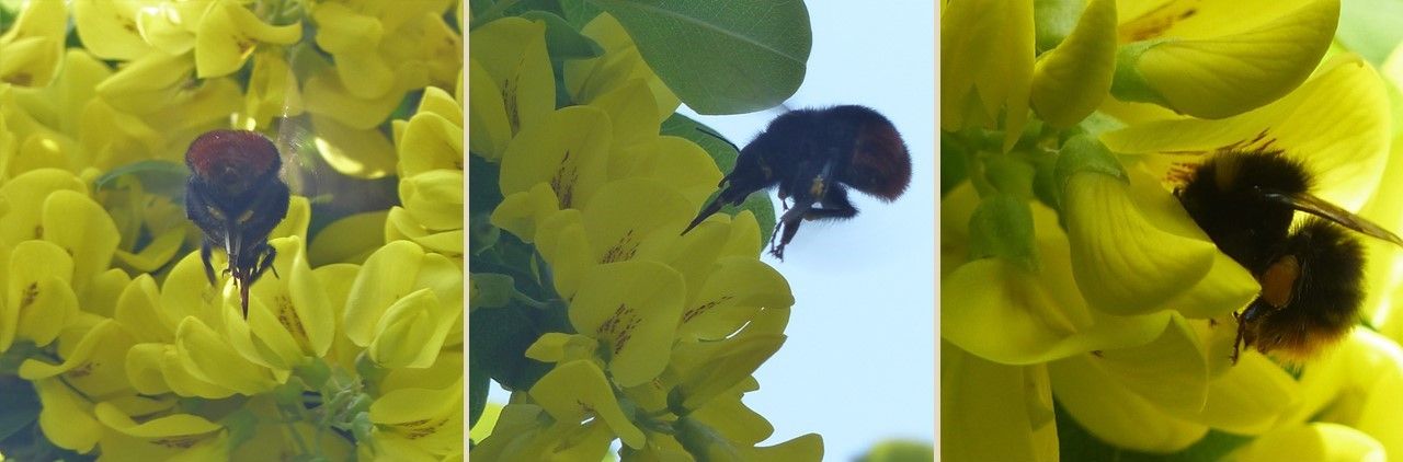 Bei den im Anflug auf eine Blüte des Goldregens befindlichen Arbeiterinnen der Wiesenhummel ist ihr 8-12 mm langer Rüssel gut zu erkennen. Fotos: M. Neitzke